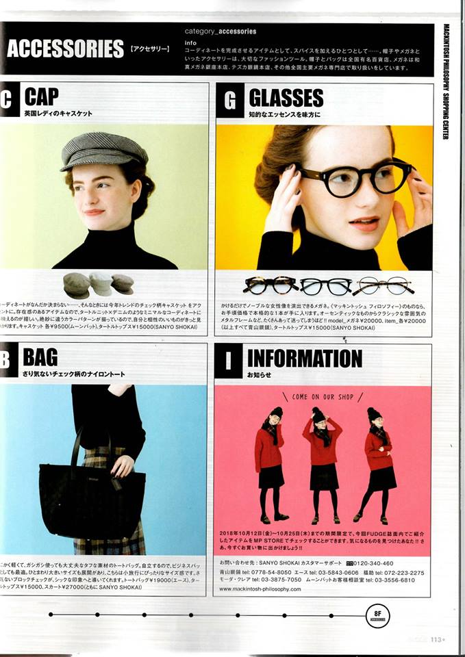 2018.11.01 Media FUDGE(ファッジ)11月号にマッキントッシュ フィロソフィーのフレームが掲載中です。 ◆掲載品番 モデル着用フレームMP5010① 下のフレーム(※左から)MP5010②MP5013③MP1006③