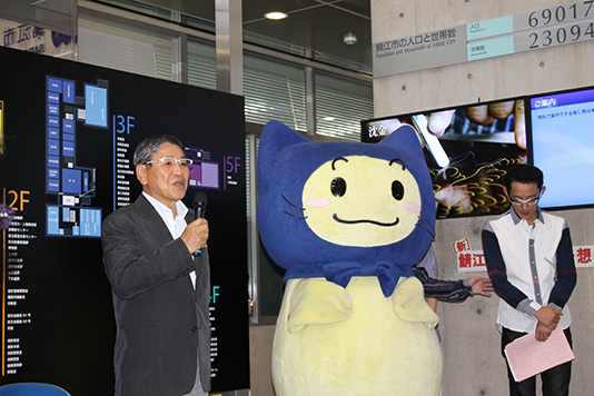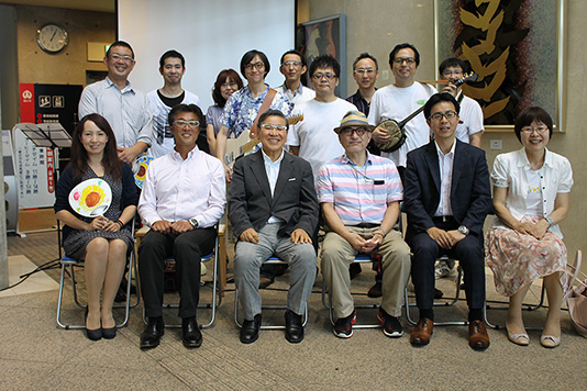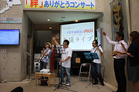 東日本大震災の被災者に鯖江市の眼鏡枠メーカーから無償で提供された「善意の眼鏡」などに感謝を伝えるため、福島県いわき市にある内山眼鏡店の内山義弘社長と、店長3人によるバンド「テンチョーズ」が9日、鯖江市役所を訪れ、ミニコンサートを行い、オリジナル曲を演奏し、眼鏡と震災が結んだ絆を強めました。